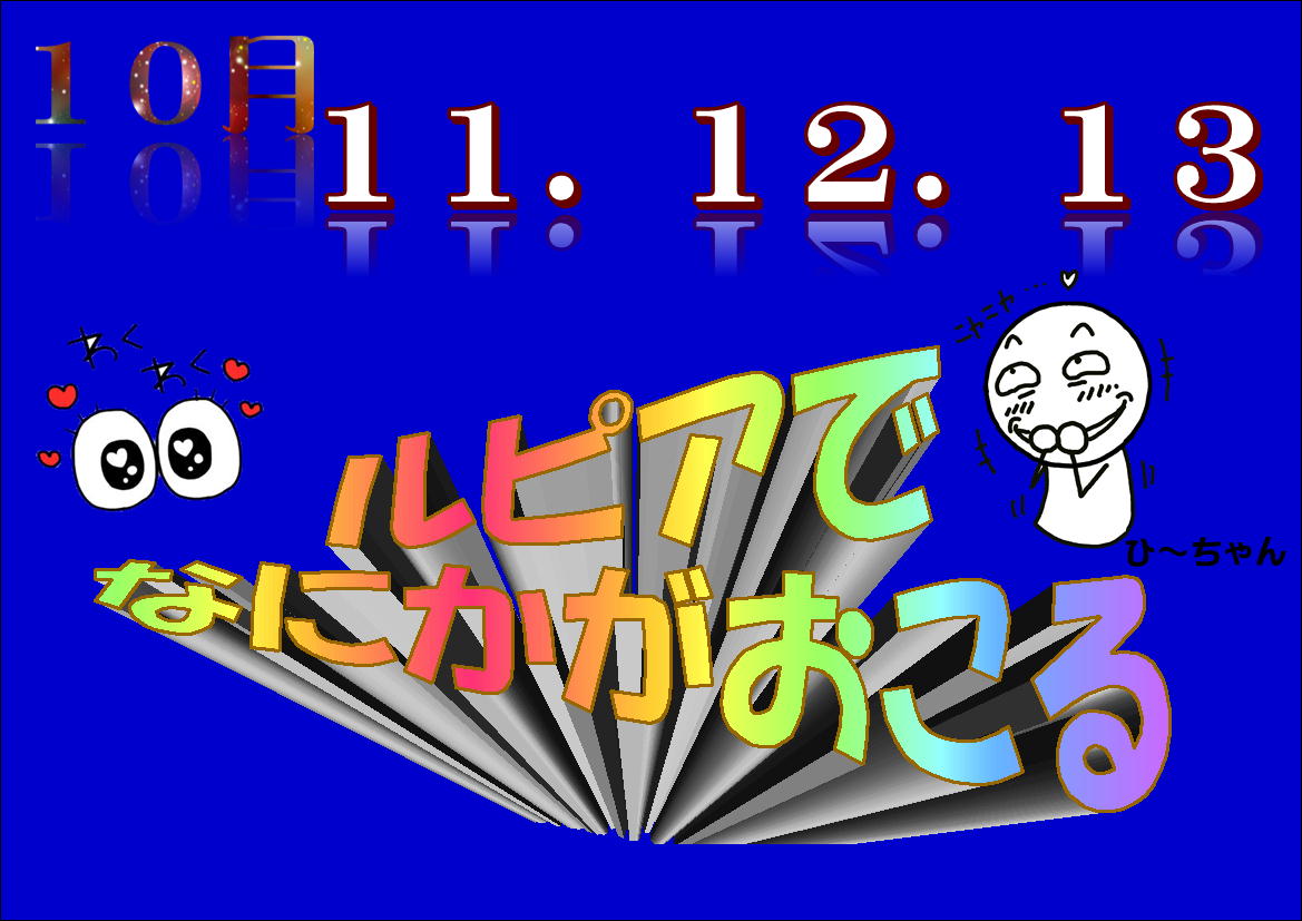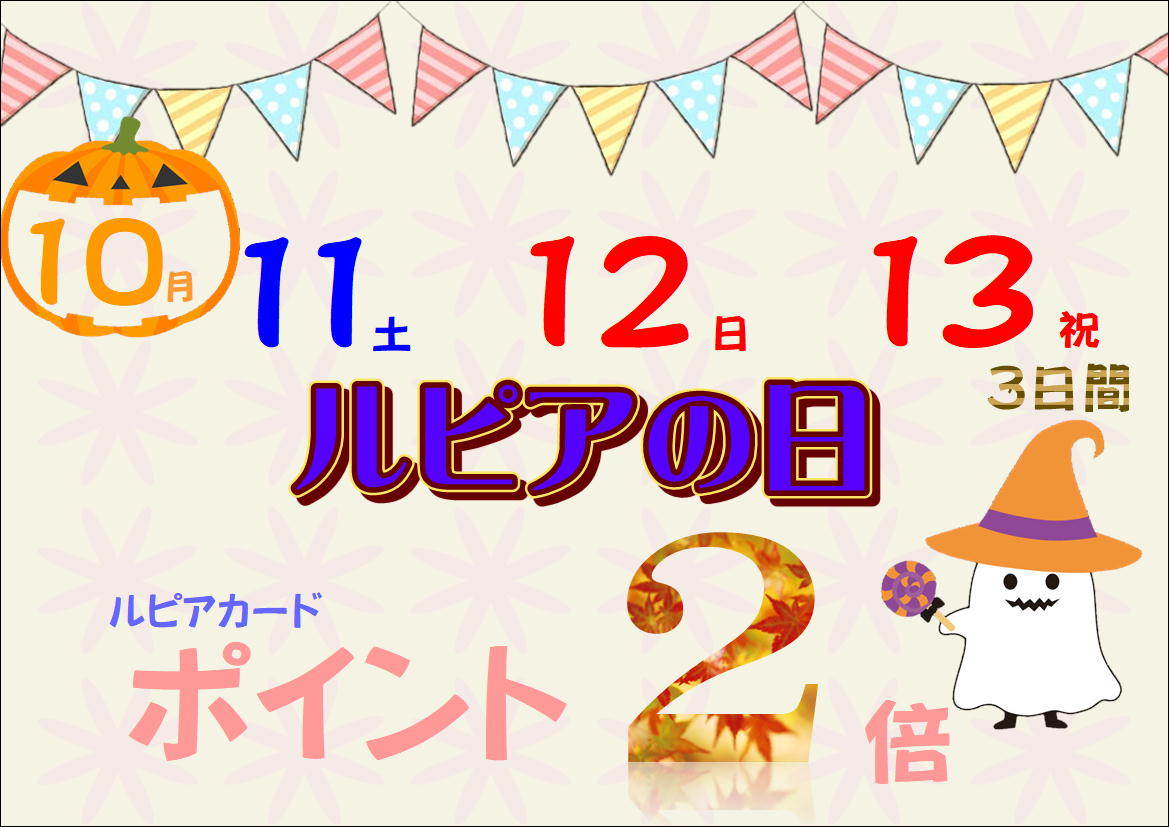 10月7日(火)・・・・・介護相談会 健祥会アムス 10月9日(木)・・・・ 血管年齢チェック 10日まで 1階キョーエイ側エレベーター前 10月11日(土)・・・・ルピアの日(ポイント2倍) 何かがあるよ~ 10月12日(日)・・・・ルピアの日(ポイント2倍 ) 何かがあるよ~ 10月13日(祝)・・・・ルピアの日(ポイント2倍) 何かがあるよ~ 10月17日(金)・・・・au料金相談会 19日まで 1階キョーエイ側エレベーター前